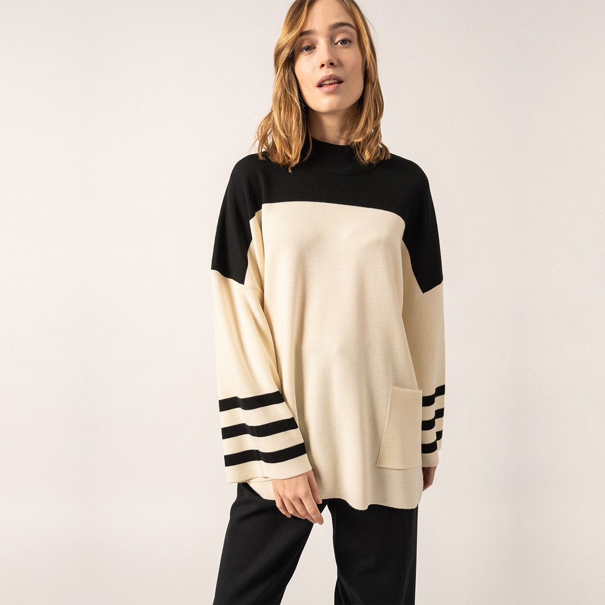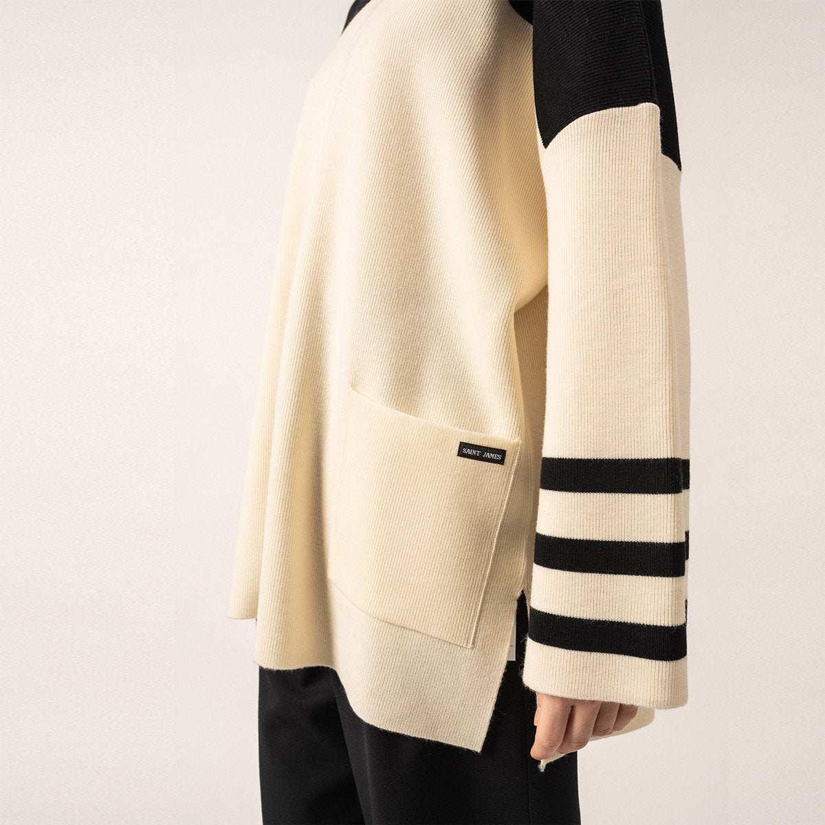 Gefertigt aus feinster Wolle, bietet dieser Pullover eine unglaublich weiche Haptik und eine hervorragende Wärmeisolierung. Der klassische Kragen verleiht dem Pullover eine zusätzliche Note von Raffinesse. Die schwarzen Schultern und die schwarzen Streifen an den unteren Ärmeln setzen stilvolle Kontraste, die den Pullover zu einem echten Blickfang machen.