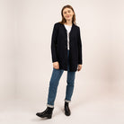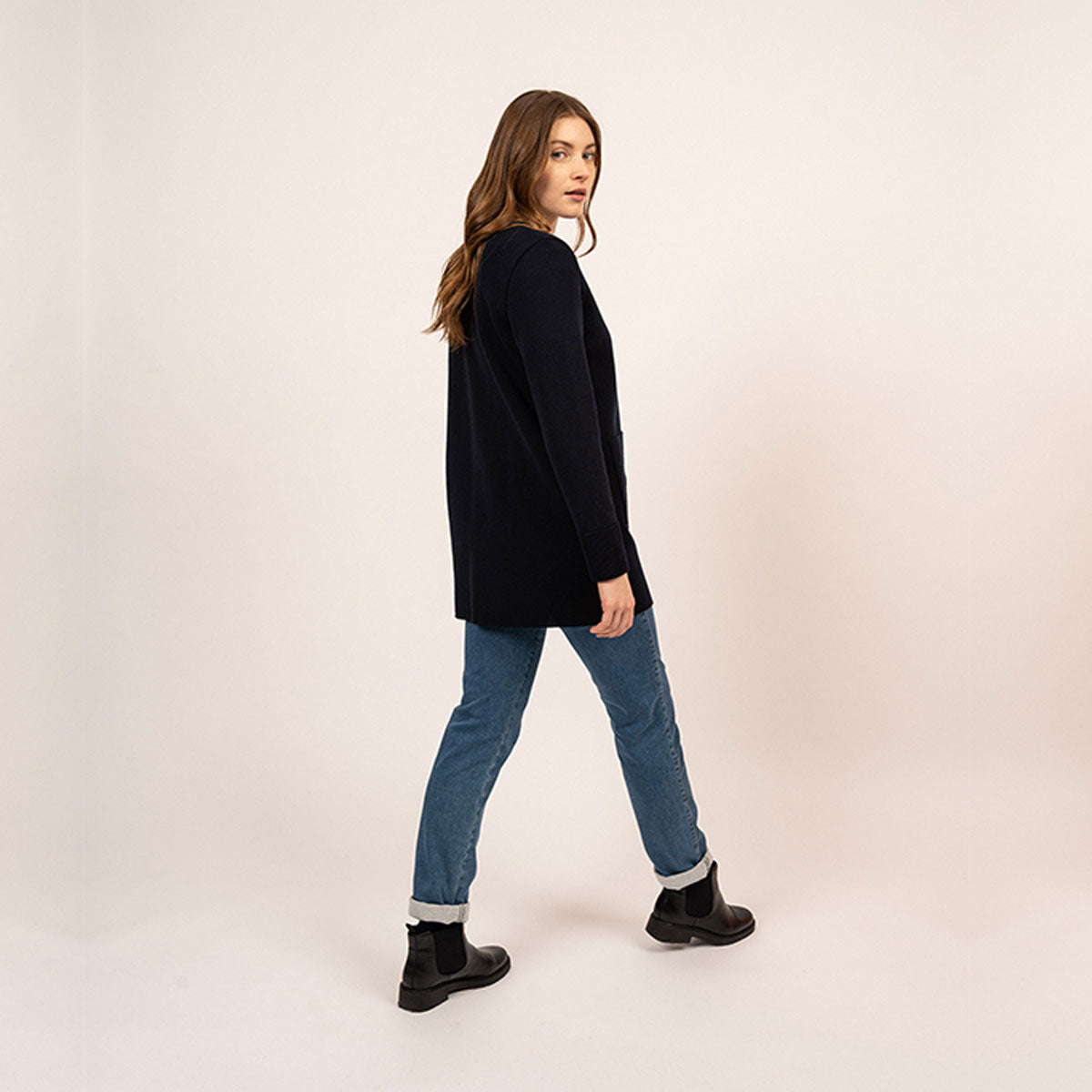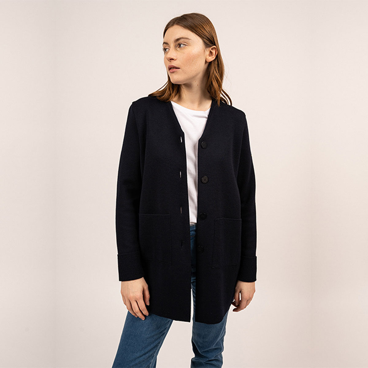 Der zeitlose, gerade Schnitt dieser Strickjacke sorgt für eine schlanke Silhouette und lässt sich vielseitig kombinieren. Die Länge, die bis über den Po reicht, bietet zusätzlichen Komfort und eine elegante Optik. Klassische Details wie der V-Ausschnitt und die Knopfleiste verleihen der Jacke eine zeitlose Eleganz.