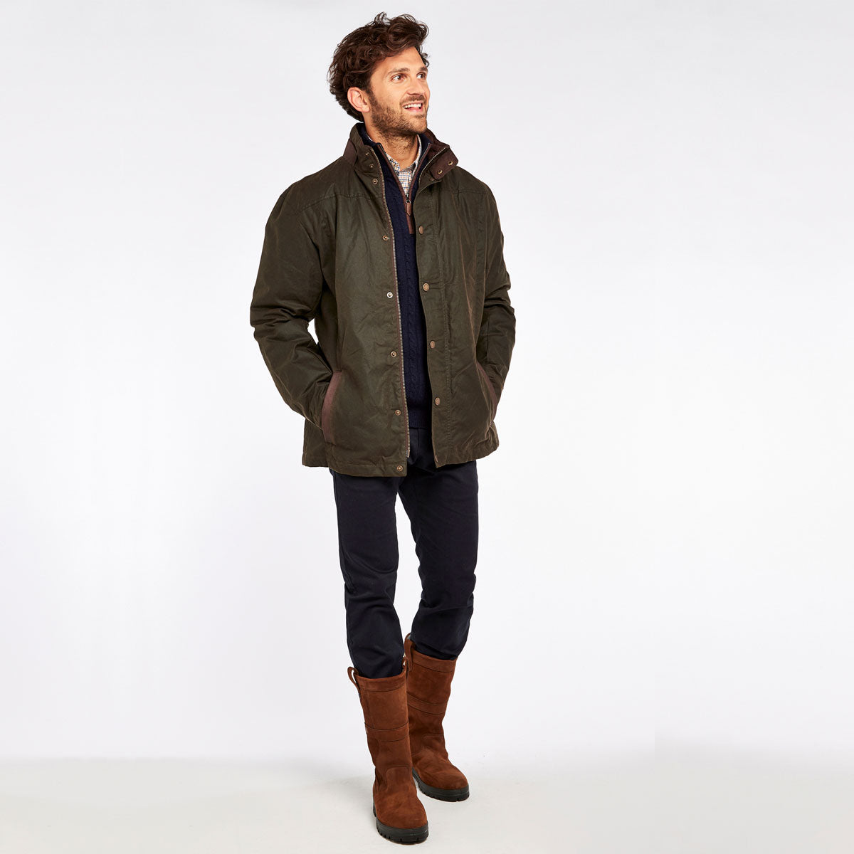 Der hohe Kragen mit Druckknöpfen bietet zusätzlichen Schutz vor Wind und Wetter. Die Jacke verfügt über einen durchgehenden Reißverschluss, der durch eine zusätzliche Knopfleiste abgedeckt ist, um extra Schutz zu gewährleisten. Zwei seitliche Einschubtaschen bieten ausreichend Platz für persönliche Gegenstände. Diese Jacke ist wetterfest, da die gewachste Baumwolle und die hochwertige Verarbeitung sie ideal für wechselhaftes Wetter machen. Der Tragekomfort wird durch das weiche Innenfutter und die bequeme Passform erhöht. Das zeitlose Design und die elegante Farbgebung machen die Jacke zu einem vielseitigen Begleiter für verschiedene Anlässe, von Outdoor-Aktivitäten bis hin zu städtischen Abenteuern.